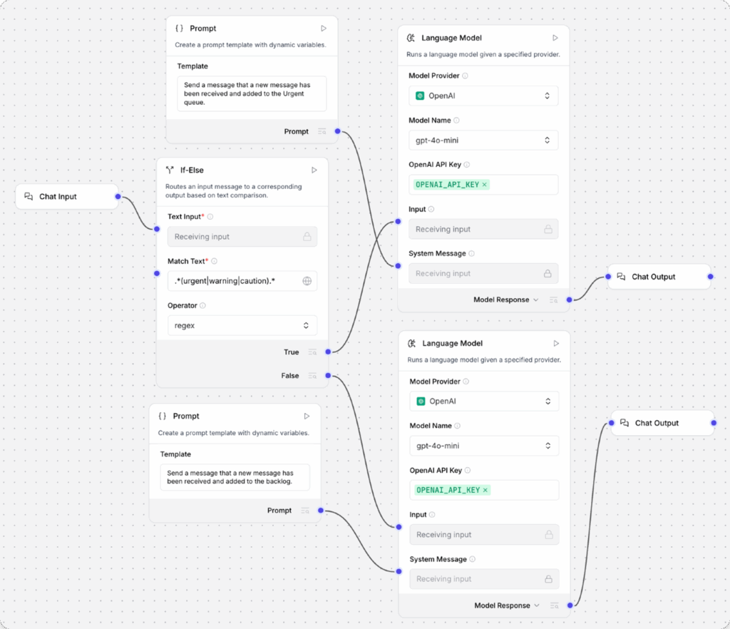 Connect the If-Else component’s False output port to the second Language Model component’s Input port. In the second Prompt Template, enter instructions for the model when the evaluation is false, such as Send a message that a new low-priority message was received.