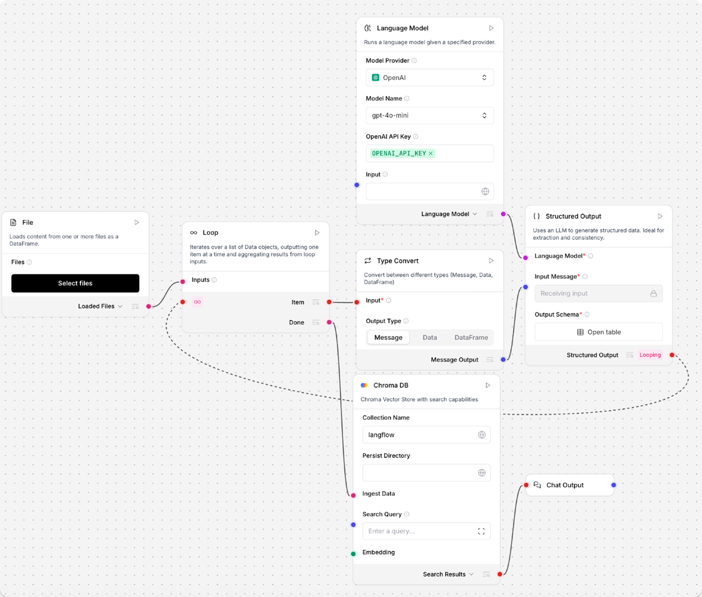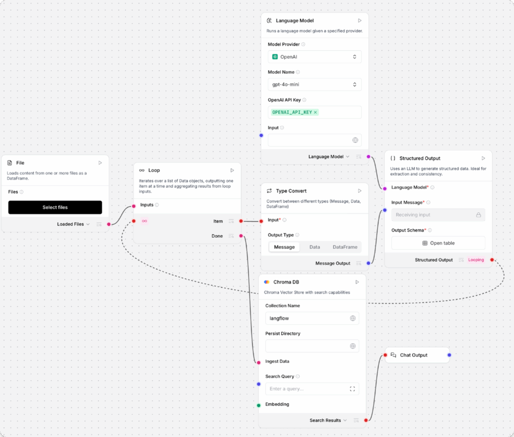 In the following example, the Loop component iterates over a CSV file until there are no rows left to process. In this case, the Item port passes each row to a Type Convert component to convert the row into a Message object, passes the Message to a Structured Output component to be processed into structured data that is then passed back to the Loop component’s Looping port. After processing all rows, the Loop component loads the aggregated list of structured data into a Chroma DB database through the Chroma DB component connected to the Done port.